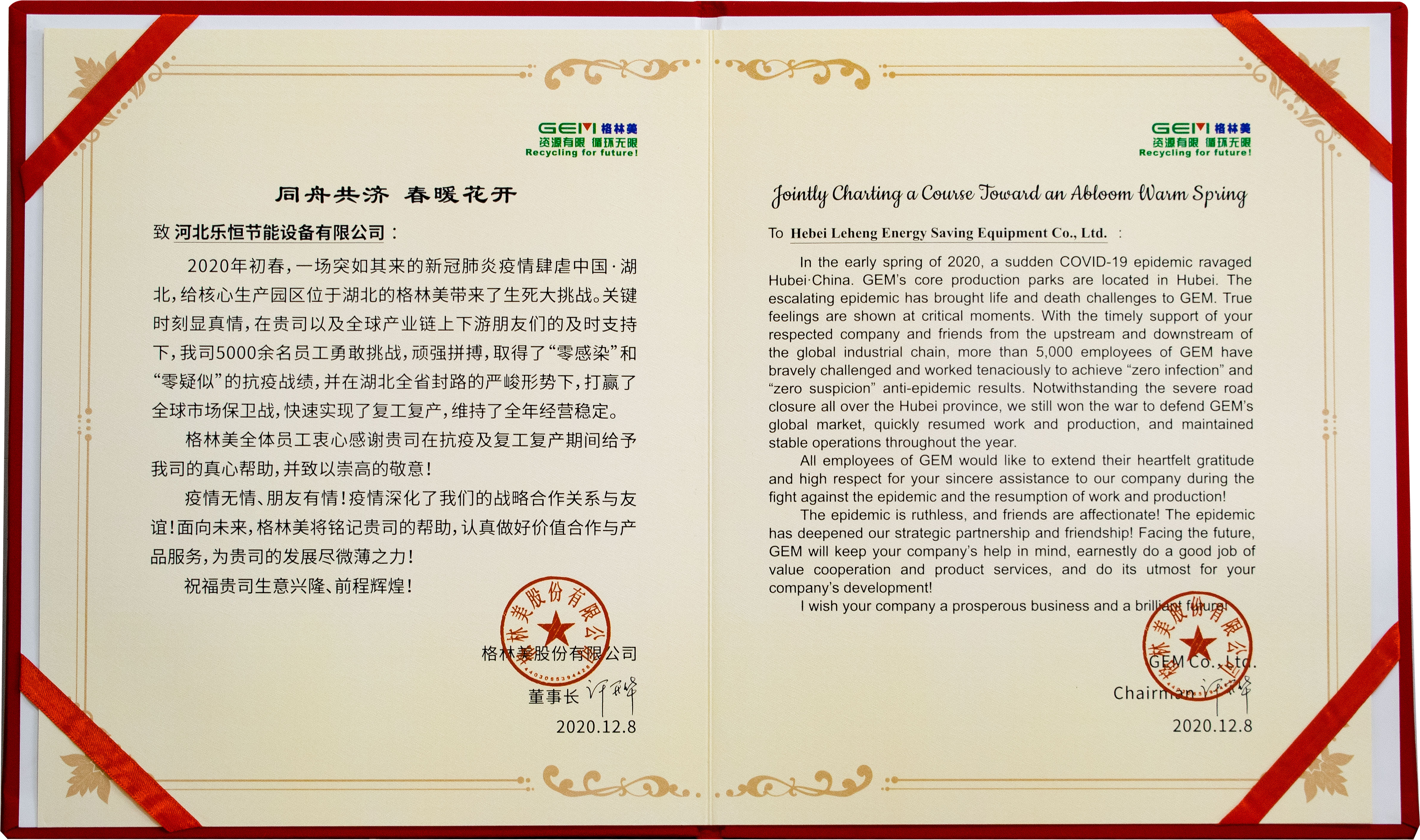 樂恒在2020年抗疫及復(fù)工復(fù)產(chǎn)期間,還收到了來自格林美的同舟共濟感謝狀。