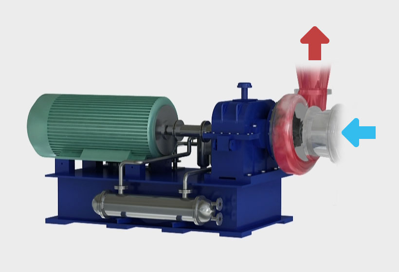 原動機(電機或者其它動力機械)帶動主軸葉輪轉(zhuǎn)動,在離心力作用下,蒸汽被加速從葉輪流出,從而使葉輪上游的蒸汽補充到葉輪。由于葉輪的連續(xù)高速旋轉(zhuǎn),蒸汽能連續(xù)不斷地被加速流出葉輪,從而保持了壓縮機中蒸汽的連續(xù)流動。蒸汽因離心作用增強了葉輪出口的壓力,并且以很大的速度離開葉輪。蒸汽經(jīng)擴壓器逐漸降低了速度,動能轉(zhuǎn)變?yōu)殪o壓能,壓力增加,溫度升高。